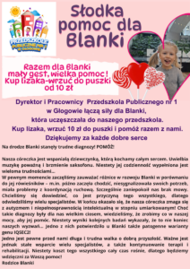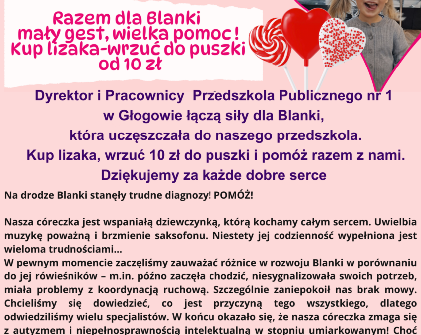 w dniach od poniedziałku do czwartku, podczas obchodów Dni Babci i Dziadka w naszym przedszkolu i żłobku, zapraszamy Was do udziału w małej, ale bardzo ważnej akcji charytatywnej. Pomagamy Blance, która przez rok była częścią naszej przedszkolnej społeczności. Blanka zmaga się z wieloma przeciwnościami, m.in. z autyzmem, a jej codzienność oraz leczenie wymagają ogromnego zaangażowania i wsparcia finansowego.